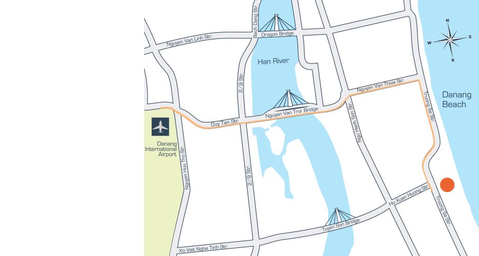 Access: From Da Nang International Airport, take the Airport Road to Duy Tan street, drive over Nguyen Van Troi brigde, then drive towards the end of Nguyen Van Thoai street . Make a right turn into Truong Sa street, continue to drive to the cross road Truong Sa and Ho Xuan Huong street and you will see the hotel entrance sign on the left side right.